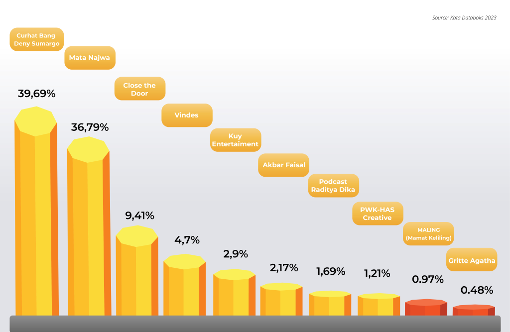 Menurut data yang dihimpun We Are Social dalam laporannya yang berjudul “Digital 2022: April Global Statshot Report”, ada sekitar 35,2 persen pengguna internet Indonesia yang berusia 16 hingga 64 tahun secara aktif mendengarkan Podcast setiap minggunya. Persentase tersebut menempuh urutan kedua setelah Brazil.